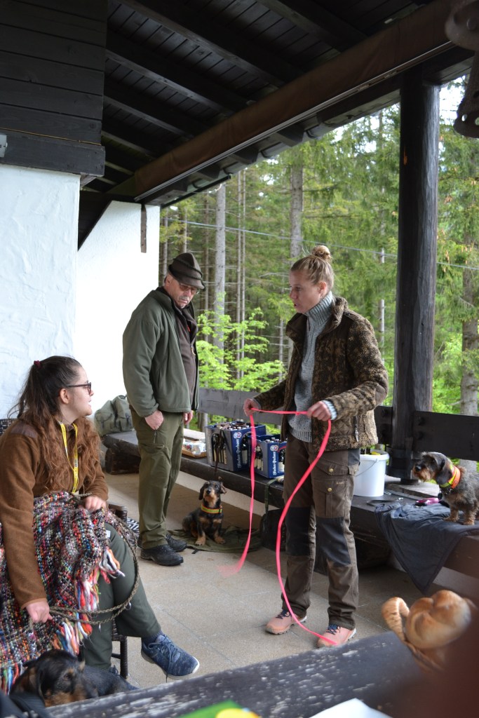 Geimpft, getestet oder genesen, sind wir am 29. – 30. Mai der Einladung unsere Kollegen des Tiroler Dachshundeklubs gefolgt, um an einem Übungswochenende zur Anlageprüfung ober und unter der Erde, teilzunehmen. Am Samstag Morgen, trafen wir uns in Jenbach beim Jagdhaus von Peter Schwärzler und Kathi Hittmair. Nach einer Kaffeestärkung erklärte uns Clarissa Günnewig die Prüfungsordnung bzw. Ablauf, Zuchtschauteilnahme, Fellpflege und sonst noch alles Wissenswerte rund um unsere Hunde.