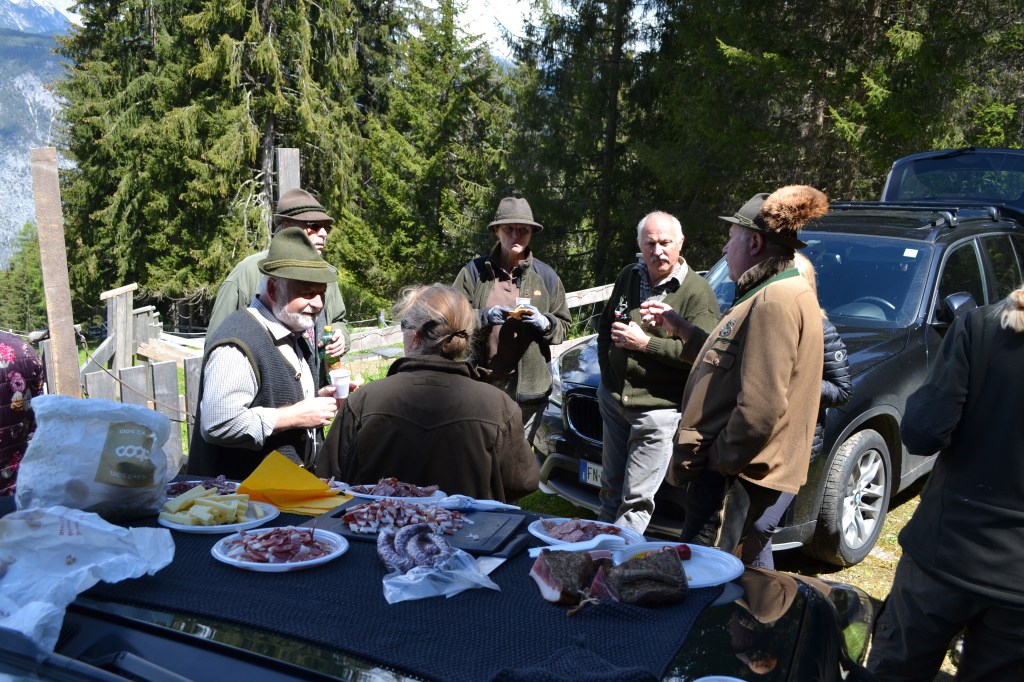 Nach der Mittagsjause mit Weißwurst und Bier, durften wir mit unseren Hunden, die am Morgen gelegten Schweißübungsfährten ausarbeiten. Alle Gespanne haben dies bravourös gemeistert, und Hunden und Führer war die Freude daran anzusehen. Bei einer gemütlichen Marende haben wir noch bis Abends gegenseitige Erfahrung ausgetauscht.