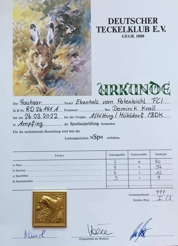Ebenholz vom Paternbichl, sprich Rudi, hat erfolgreich die Spurlautprüfung Jugend im 1. Preis bestanden. Trotz schwieriger Bedingungen mit sehr trockenem Boden, Wind und hohem Hasenbestand, hat es der Jungspund top gemeistert. Glückwunsch und Weidmannsheil Dominik mit Rudi.