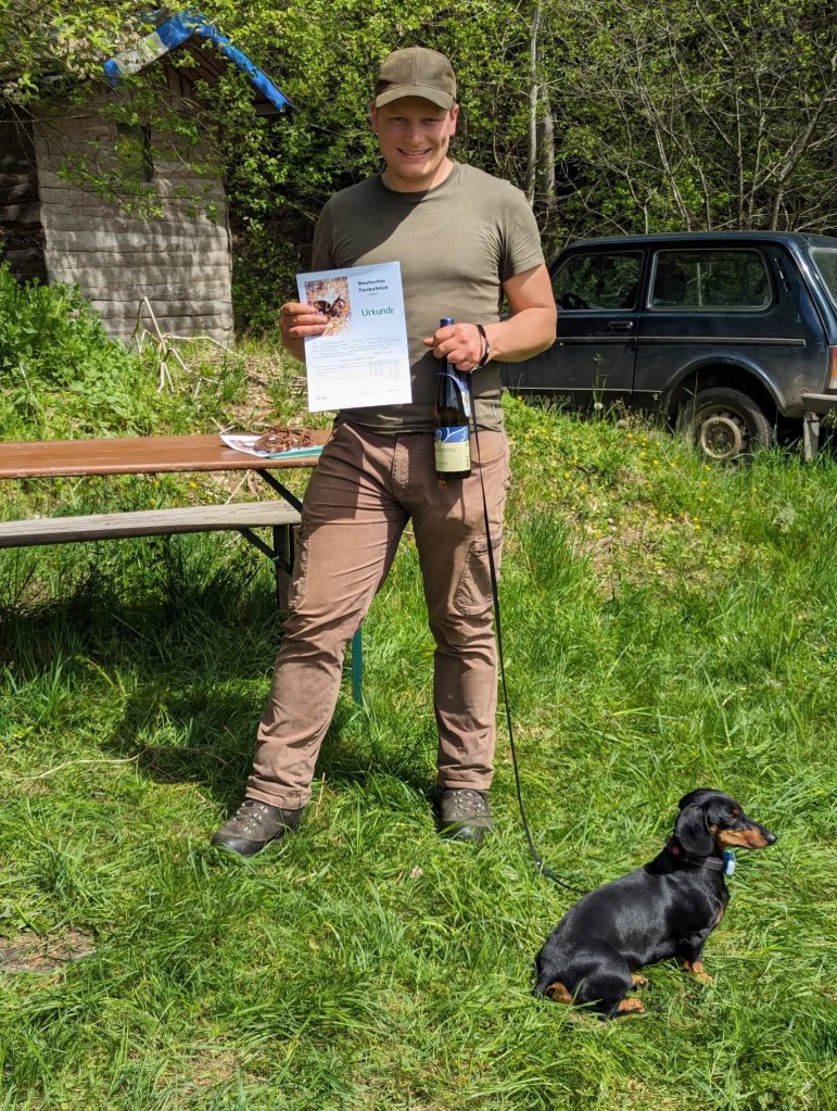 Unser Prüfungsjahr geht erfolgreich weiter. Peter hat mit seiner Loni vom Lindnergrund, die Schweißprüfung in der Sektion Wendelstein/Bayern, im 2. Preis bestanden. Es schien gar keine leichte Aufgabe für alle Gespanne. Auch Loni hatte anfänglich Startschwierigkeiten, ging dann aber wie auf Schienen zum Stück. Deshalb wurde sie auch Tagessiegerin. Bravo dem Gespann und Suchenheil.